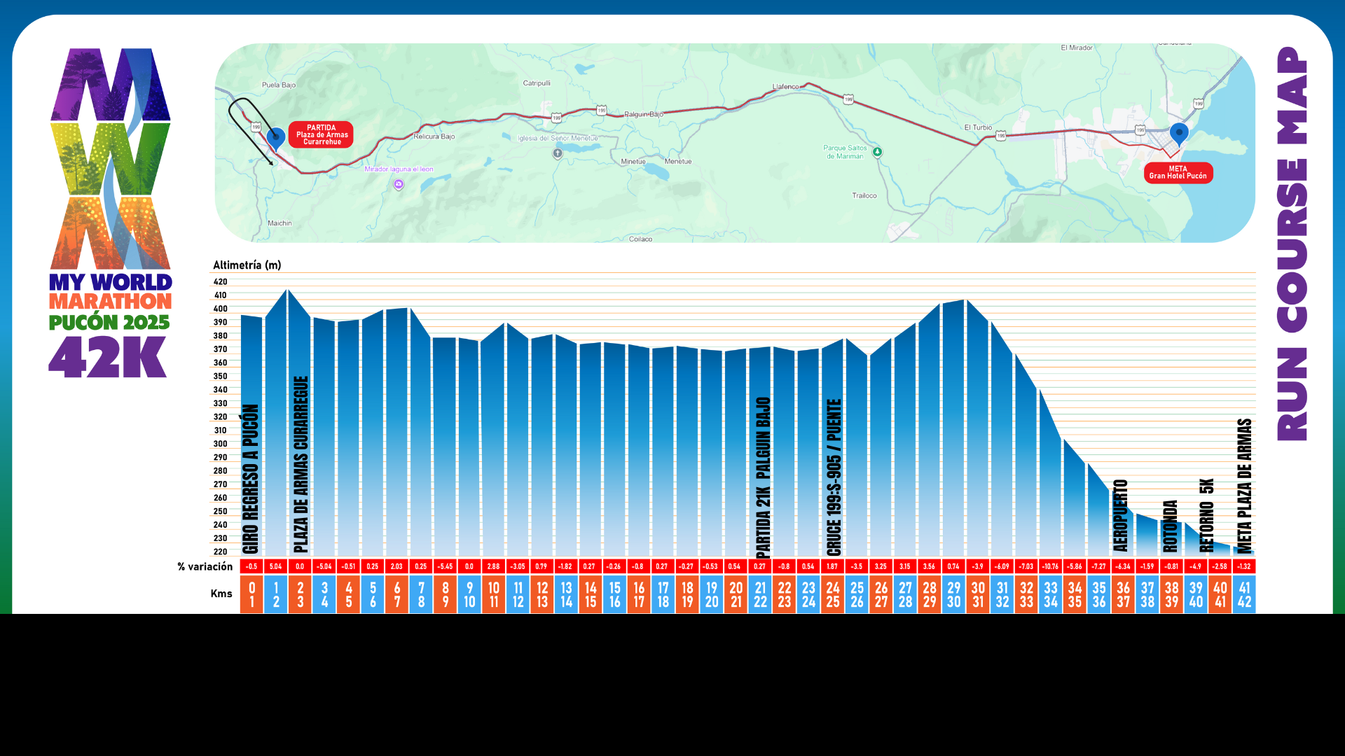 La distancia de Maratón (42.195 metros) El lugar de partida y/o meta, los recorridos o circuitos señalados y horarios del largada, precedentemente podrán ser modificados o alterados en todo o parte por la Organización a su total y completa discreción, sin expresión de causa. Asimismo, el lugar de partida y/o meta, y/o los recorridos o circuitos podrán ser también modificados, alterados en todo o parte por las autoridades, como la SEREMI de Transportes y Telecomunicaciones, Gobierno Regional, Intendencia o cualquier municipalidad o Carabineros de Chile.