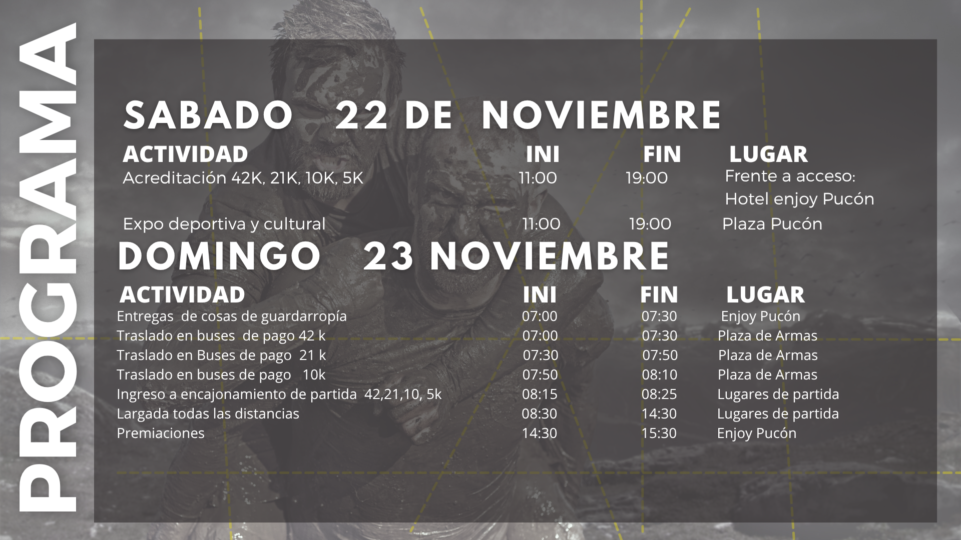 Los números departicipación y chips de cronometraje electrónico serán entregados a los participantes en la Expo-Running, que se realizará en el Hotel Pucon , ubicada en la comuna de Pucón, o en el lugar que indique la Organización. Dicha entrega se hará única y personalmente a los participantes previamente inscritos, los que deberán presentar su cédula de identidad o pasaporte y documento sanitario, si éste fuere exigido por la autoridad. La Expo- Running estará abierta a contar del sábado 22 de noviembre de 2025, desde las 10:00 horas hasta las 19:00 horas.